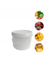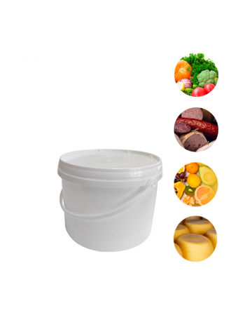 White plastic bucket with lid. Nominal capacity: 10 000 ml Total capacity: 11 650 ml. Total usable capacity: 11 100 ml. Polypropylene(PP). Food quality.